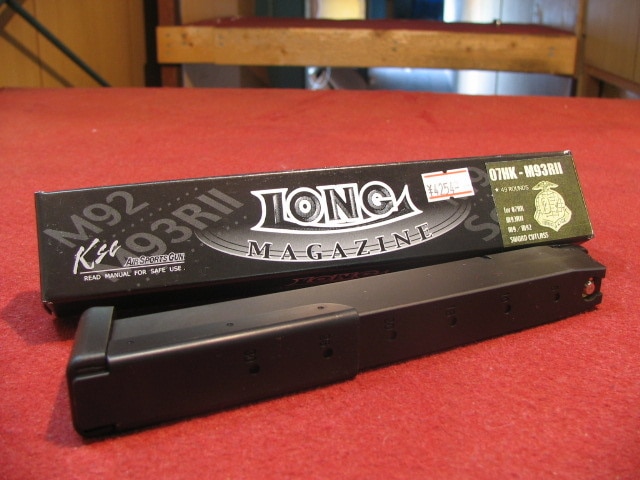 KSCのM93R2(07バージョン)用49連ロングスペアマガジン。ガスタンク容量のアップした一体型マガジンだ。