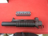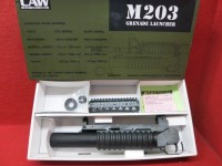 次世代M4用アダプターとRASハンドガード上部付き。このM203グレネードランチャーはCAWで独自に設計・製作したもので、既存の他社製と異なり、実銃どおりに太いリブの入ったハンドガードや、リアルサイズのセフティレバーなど、こだわりのディティールで仕上げである。