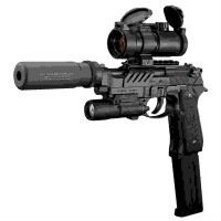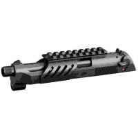 東京マルイ・電動M9A1用スライド一体型マウントレイル。 スライド・アウターバレル・スライドレイルが一式になっている。 マウントレイルは別パーツをまるで取り付けたように見えるのが格好よい。 マズルの先端は14mmの逆ねじになっていてカバーも付いている。 写真の本体等は装着例で付属しません。