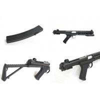 全長:500mm / 690mm、重量:2845g、スチールフレーム&アウターバレル、スチール製マガジン:装弾数110発(スペアマガジン税抜3,600円)、フォールディングストック、可変ホップアップ、本体後部にバッテリー収納・ミニコネクター※別売りOP-NO.1のLIPOバッテリー7.4V1100mah-GB0028の小型PEQタイプ等が対応