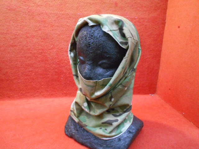 TMCの純正実物のマルチカモ柄をプリントした生地を使いバラクラバとしたもの。サバイバルゲイムでガンを頬付けも普通にできるプロテクターで、いわゆる目だし帽、伸縮性があるのでフリーサイズに対応し装着感もよく着脱も容易で良い感じ。生地を筒状にしたもので、バラクラバ的やマウスガード的、ネックガード的に形態を変化できる。