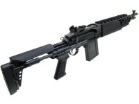精度が良く射程の長い戦場での使い勝手の良いM14を、現代戦にあわせてモデェファイしたカスタムスナイパーのEBRは、短縮されたフロント部分に拡張性アップの為のピカティニーレールが4面装備され、ストックは6段伸縮式のストックで上部にチークピースが装着されている。
