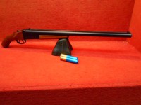 このモデルのバレルは金属製でストックは木製。アルミ削りだしの美しいガスショットシェルが2発付属していて、バレルをテイクダウンしてシェルを2発セットできる。