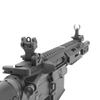 マズルはロングファイヤーエクステンションタイプで14mm逆ネジ、サイトはフロント・リヤともTROYタイプのフリップアップタイプ、マガジンはノンスリップテクスチャが施された樹脂製マガジンで140連、ストックはVLTOR Modタイプ、グリップはTangoDownタイプ。