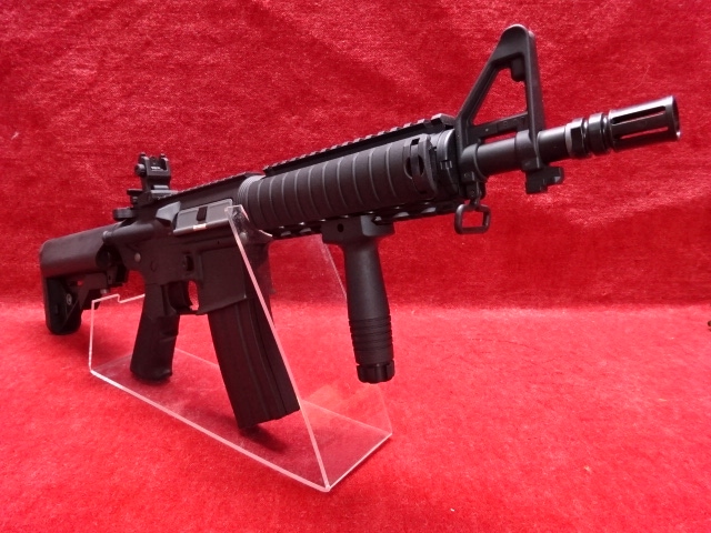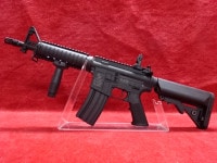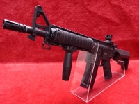 電子トリガー搭載で、トリガーレスポンスのキレが良い。10.5インチバレルを持つ、取り回しの良い(通常のM4バレルは14.5インチ)全長が短いM4CQBだ。RASハンドガードを装備し、現代のモデルとして、別売りライトやレーザーが脱着が自在で拡張性が高い。マガジンは多弾倉の300連、リヤサイトはフリップアップサイト、クレーストック装備でバッテリーはストック内に別売りのセパレートミニバッテリー(LIPO7.4V、ニケル水素8.4V)が収納される。