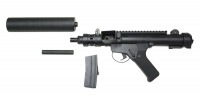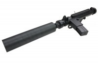 このモデルは、サイレンサー、エクステンションバレル、脱着式20mmマウントベース付きでストックレス。