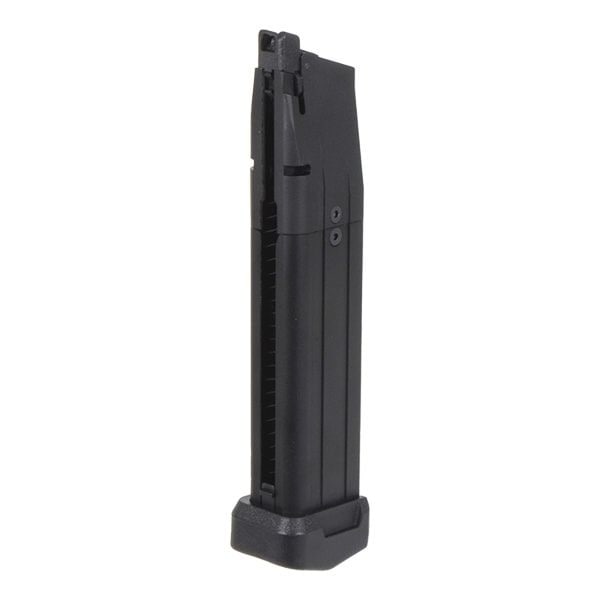 CO2 ミニボンベを格納し、マガジン内部にガスを充填して使用するタイプのマガジンとなりますが、マガジンハウジングに軽量で耐久性の高い6061 T6アルミニウム合金材を主材としてCNC切削にて製作されており、内圧のかかる充填方式に対する耐久性を保ちつつもマガジンの全体重量を約 250gと比較的軽量に仕上げられたマガジンとなっています。