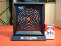 東京マルイのプロキャッチターゲット。 特殊粘着素材の標的面にBB弾が瞬間的に付着してゆっくりと真下に滑り落ちてくるので、着弾位置確認が容易なのと、BB弾がターゲットのBB弾受けに落ちるので、BB弾が散らからなくて便利。