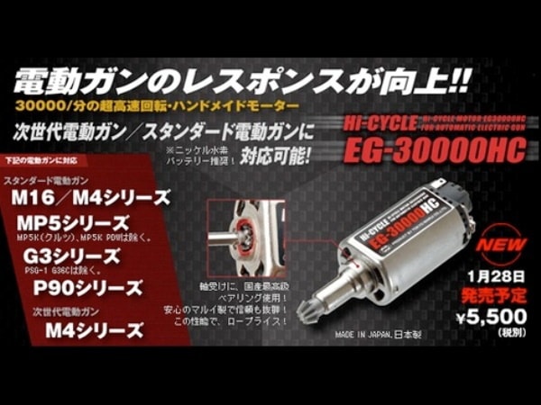 今までのカスタムモーターは、連射向上が体感できなかったり、向上しても電力の消耗が以上に高く、使いずらいところがあったが、このEG30000は、確実に連射を15%UPし、電力燃費もEG1000と同等、しかも価格も値ごろ感がある超実力派だ。このEG30000は、東京マルイHCシリーズ電動ガンに装備されている純正ハイスピードモーター。電極コイルワイヤーを手巻きでしか出来ないレベルで大幅に巻き増し、軸受けに最高級国産ベアリングを使用した結果、毎分3万回転という驚異的な回転数を実現した。搭載磁石を強力にしたものではない為、起動電力が高くなく、燃費が良いのもこのモーターの特徴だ。単純に搭載し換えるだけでも、EG1000に比べ15%程度のサイクルアップとなる。この仕上がりと実力でこの価格は大変お買い得。機種やバッテリーにもよるが、簡単に秒間20発弱(使用バッテリーが、8.4V3000Aクラスなら秒間23発くらいまでアップする)にチューンできるこのモーターは凄い。