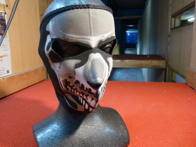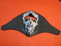 骸骨柄がプリントされていて、戦国時代の兜の頬あての様に敵に対する威嚇効果があるのが良い感じだ。米国のペイントガンゲーム用に開発されたプロテクトマスク。サバイバルゲイムでガンを頬付けも普通にできるプロテクターで、口と鼻の部分には通気口が設けてある。固定はベルクロで、伸縮性あるのでフリーサイズに対応し装着感もよく着脱も容易で良い感じ。何といってもスカルタイプという遊び心が良いではないか。ネオプレーン材を使用し、BB弾が着弾したときのショックを吸収する。